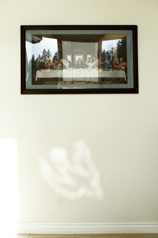 THE DESCENT OF THE DOVE: This photo reveals the Dove of the Spirit descending upon Jesus. Five things made this possible: First, the exquisite embroidery of the Lord’s Supper by an elderly North Korean artist; second, a beautiful hanging created by the artist Professor Ellen Shim; third, a photo taken of the two works of art by master photographer Joon Lee; fourth, the beautiful worship center that God gave to us at YWAM-AIIM Pneuma Springs where we could hang these works of art; and fifth, the Holy Spirit who caused the brightness of the sun to cause the reflection of the hanging in the embroidery. The Holy Spirit did indeed descend upon Jesus, at the beginning of His ministry, and also at the Last Supper.